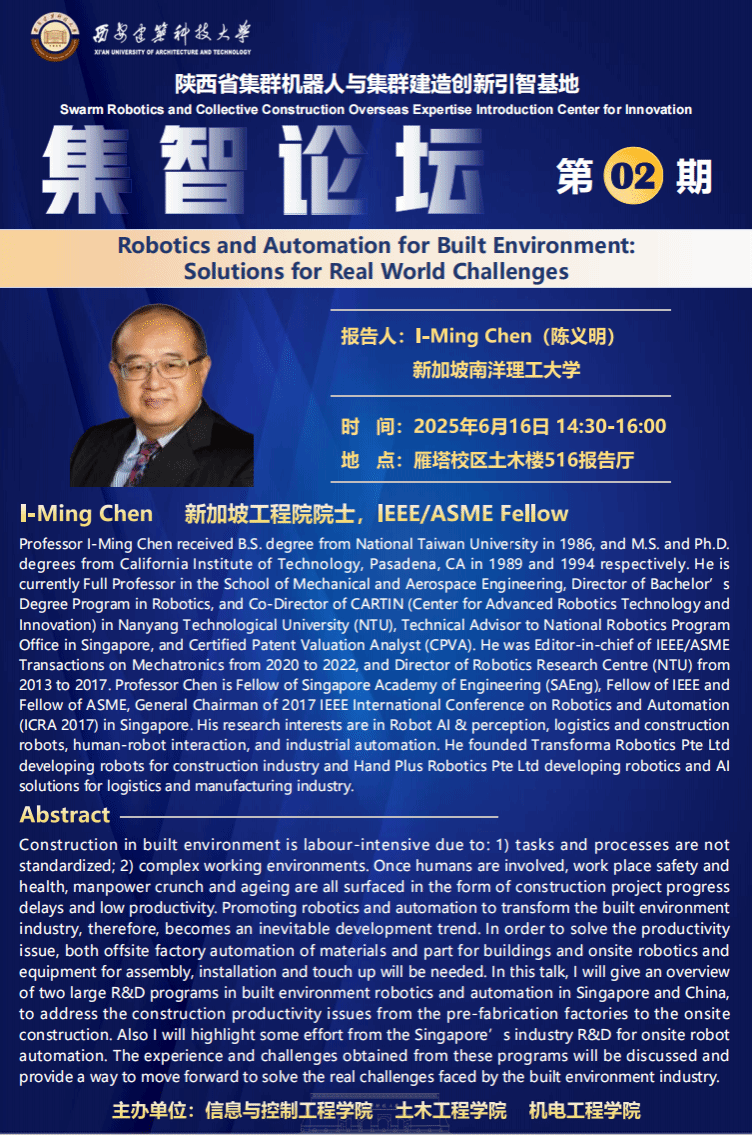 报告人简介:Professor l-Ming Chen received B.s. degree from National Taiwan University in 1986, and M.s. and Ph.Ddegrees from California institute of Technology, Pasadena, CA in 1989 and 1994 respectively. He iscurrently Full Professor in the School of Mechanical and Aerospace Engineering, Director of Bachelor'sDegree Program in Robotics, and Co-Director of CARTlN (Center for Advanced Robotics Technology andInnovation) in Nanyang Technological University (NTU), Technical Advisor to National Robotics ProgramOffice in Singapore, and Certified Patent Valuation Analyst (CPVA). He was Editor-in-chief Of IEEE/ASMETransactions on Mechatronics from 2020 to 2022, and Director of Robotics Research Centre (NTU) from201 3 to 2017. Professor Chen is Fellow of Singapore Academy of Engineering (SAEng), Fellow of lEEE andFellow of ASME, General Chairman of 2017 lEEE international Conference on Robotics and Automation(ICRA 2017) in Singapore. |